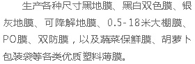 生产各种尺寸0.5-18米大棚膜、PO膜、双防膜、黑地膜、黑白双色膜、银灰地膜、可降解地膜,以及蔬菜保鲜膜、胡萝卜包装袋等各类优质塑料薄膜。